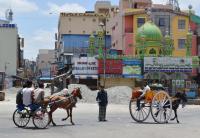 People using horse carts to reach to their destination at KR Market during lockdown in the wake of the 2nd wave of COVID-19, in Bengaluru on Sunday 30th May 2021