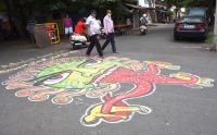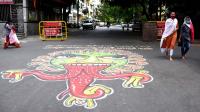 Vinayaka Gelayara Balaga members painting Coronavirus theme on road at Chamarajpet to create awareness on Coronavirus during lockdown in the wake of the 2nd wave of COVID-19, in Bengaluru on Thursday 3rd June 2021