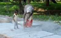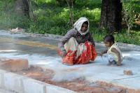 A woman with her child seen cleaning the footpath at Cubbon Park, the footpath work is under progress, in Bengaluru on Monday 21st June 2021