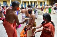 Devotees partake in Tapta Mudraadharana at Pejawar Mutt Vidyapeetha, in Bengaluru on Tuesday 20th July 2021