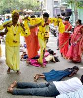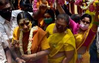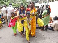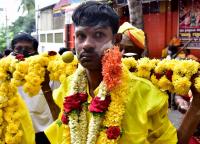 Devotees with cheek pierced with a metal rod carry Kavadis during a procession on the second Monday of the holy month of shravan at Hanumanthnagar, in Bengaluru on Monday 2nd August 2021