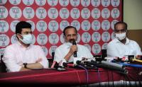 Karnataka BJP MPs DV Sadananda Gowda, PC Mohan and Tesjasvi Surya addressing a press conference, in Bengaluru on Saturday 7th August 2021