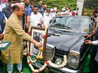 CM Basavaraj Bommai with the vintage car which was used by Former CM Devaraj Urs during birth anniversary programme at Vidhana Soudha, in Bengaluru on Friday 20th August 2021