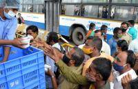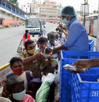 People standing in long line to collect the food at Majestic Bus Stand during Coronavirus pandemic, in Bengaluru on Tuesday 7th September 2021