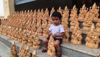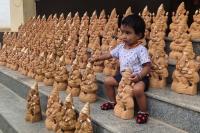 A baby sitting next to Ganesha Idols, ahead of Ganesh Chaturthi Festival, in Bengaluru on Wednesday 8th September 2021