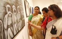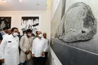 Chief Minister of Karnataka Basavaraj Bommai looking at the Gandhi principles artwork on the occasion of Gandhi Jayanti at Chitrakala Parishat, in Bengaluru on Saturday 2nd October 2021