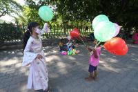 A boy selling balloons and toys on the roadside, outside Mysore Palace, during the Mysuru Dasara Festival, in Mysuru on Sunday 3rd October 2021