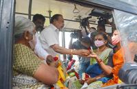 Kannada activists Sara Govind and others distributing red roses to the public to participate in the Bandh on 31st Friday at Town hall, in Bengaluru on Thursday 23rd December 2021