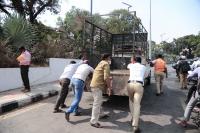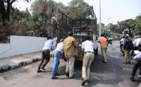 Public and police seen pushing a broken down goods carrier vehicle at KR Circle, in Bengaluru on Thursday 17th February 2022