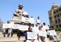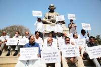 JDS MLAs and MLCs protesting against BJP and Congress party at Gandhi Statue, Vidhana Soudha, in Bengaluru on Monday 21st February 2022