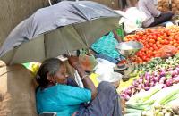 A elder woman selling vegetables under the umbrella at KR Market, with temperatures rising, in Bengaluru on Wednesday 30th March 2022