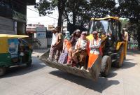 Labourers travelling on JCB vehicle without safety precaution for their work destination at Seshadripuram, in Bengaluru on Monday 2nd May 2022
