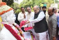 Union Home Minister Amit Shah pays floral tribute to Saint Basaveshwara on his birth anniversary at Chalukya Circle in the presence of CM Basavaraj Bommai and others, in Bengaluru on Tuesday 3rd May 2022