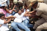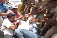 Members of Aam Aadmi Party detained by police personnel during their protest against KPSC corruption at Freedom Park, in Bengaluru on Wednesday 4th May 2022