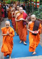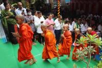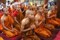 Buddhist monks offer prayers on the occasion of Buddha Purnima festival at Mahabodhi Society, in Bengaluru on Monday 16th May 2022