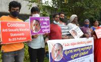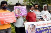 Members of Karnataka Sexual Minority Forum and Samara Society Yeshwanthapur protesting against and comdemining anti sexuality minorities statement by JDS State President CM Ibrahim, in Bengaluru on Wednesday 25th May 2022