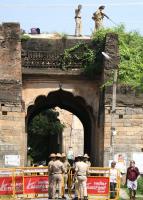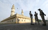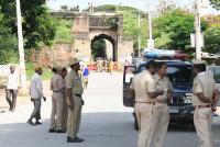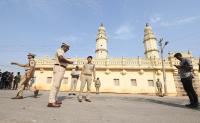 Police personnel tight security outside Jamia Masjid in the wake of Vishwa Hindu Parishad (VHP) Srirangapatna Chalo rally to perform puja at Jamia Mosque, in Mandya District on Saturday 4th June 2022