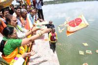 Chief Minister of Karnataka Basavaraj Bommai with his wife Chennamma offered Bagina to river Cauvery at KRS Dam, in Mysuru on Wednesday 20th July 2022