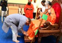 Chief Minister of Karnataka Basavaraj Bommai seeking blessings from Dr Veerasomeshwara Shivacharya Swamiji of Rambhapuri Mutt, in Bengaluru on Thursday 21st July 2022