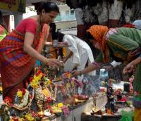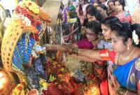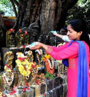 Devotees pouring milk to perform pooja at Naga statue on the occasion of Nagara Panchami at a temple, in Bengaluru Tuesday 2nd August 2022