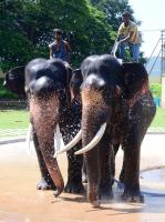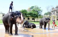 Dasara elephants getting a bath at Mysuru Palace premises, ahead Dasara 2022, in Mysuru on Wednesday 17th August 2022