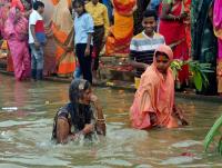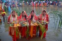 Devotees offering prayers to the Sun God on the occasion of Chhath Puja at Rachenahalli Lake in Jakkur, in Bengaluru on Sunday 30th October 2022