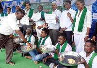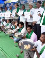 | Event Details: | Members of Rajya Kabbu Belegarara Sangha (State Sugarcane Growers Association) and Rajya Raitha Sangha (State Farmers Association) holding vessel plates with stone and mud during a protest demanding an increases in the Fair and Remunerative Price (FRP) for their crop, at Freedom Park, in Bengaluru on Thursday 1st December 2022 |