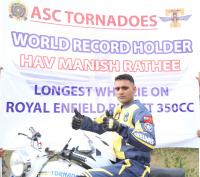 | Event Details: | Havaldar Manish Rathee of motorcycle display team ASC “Tornadoes” has created the World Record for Longest Wheelie on Royal Enfield 350cc and covered a distance of 2.4kms in 2minutes 58seconds at Nice Road, in Bengaluru on Sunday 4th December 2022 |