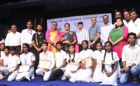 B Manjamma Jogathi, IPS officer Ravi D. Channannavar and Students during "Sikshana Habba" (Education Festival) at Nayana , in Bengaluru on Saturday 7th January 2023