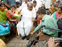 Former CM and JDS leader HD Kumaraswamy celebrating the Makara Sankranti festival with physically challenged people during his meet the press program at Press Club, in Bengaluru on Saturday 14th January 2023