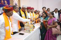 Union Minister of Jal Shakti Gajendra Singh Shekhawat with MP PC Mohan and others during meeting for Manifesto suggestion collection ahead of Assembly Election at Terapanth Bhavan, in Bengaluru on Tuesday 14th March 2023