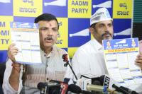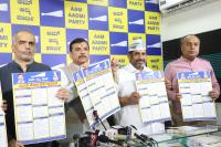 Rajya Sabha Member Sanjay Singh and AAP State President Prithvi Reddy addressing a press conference on AAP Karnataka Guarantee schemes ahead of Assembly Elections at Party office, in Bengaluru on Wednesday 29th March 2023