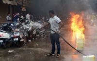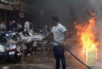 | Event Details: | A devotee trying to douse the fire, where the vehicles were burnt due to camphor lit up by the devotees as part of the Bengaluru Karaga rituals in front of Dharmaraya temple, in Bengaluru on Thursday 6th April 2023 |