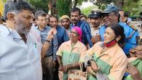 DCM DK Shivakumar interacting with BBMP Poura Karmika workers at Hebbal, in Bengaluru on Tuesday 13th June 2023