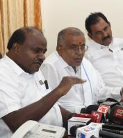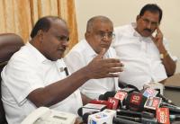 Former CM and JDS Leader HD Kumaraswamy with MLA GT Devegowda and others addressing a press conference, in Bengaluru on Thursday 20th July 2023