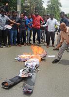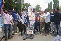 Members of Bengaluru University Postgraduate and Research Scholars Association burning effigy of Sandalwood actor Upendra for derogative cast insulting statement made at social media, in Bengaluru on Monday 14th August 2023