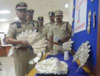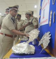 | Event Details: | Bengaluru City Police Commissioner B Dayananda inspecting the recovered stolen silver ornaments from Adinath Jain Temple at Shantinagar, the stolen ornaments were recovered from 4 arrested interstate thieves being displayed during a press conference at Bengaluru City Police Commissioners Office , in Bengaluru on Tuesday 10th October 2023 |