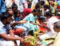 Devotees perform rituals to departed souls on the occasion of Final day of Pitru Paksha Mahalaya Amavasya at Kashi Vishwanath Temple, in Bengaluru on Saturday 14th October 2023