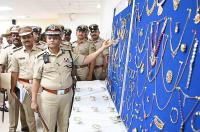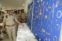 Police Commissioner B Dayananda inspects the jewels which were seized from dacoits Nepali Gang during a press conference at Commissioner of Police Office , in Bengaluru on Tuesday 28th November 2023