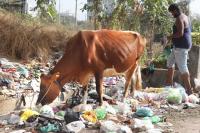 A cow eating plastic, which is dumped on roadside at Vishweshwaraiah Layout, in Bengaluru on Tuesday 30th January 2024