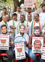 Members of Bengaluru City Youth Congress protesting against BJP leaders KS Eshwarappa and Tejasvi Surya for their bad statement on Congress leaders DK Suresh and Vinay Kulkarni, in Bengaluru on Friday 9th February 2024