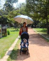 A mother using an umbrella to cover herself and her baby from the scorching heat at Lalbagh, in Bengaluru on Thursday 22nd February 2024