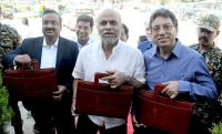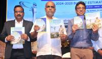 BBMP Administrator Rakesh Singh with BBMP Commissioner Tushar Girinath and Special BBMP Commissioner Shivanand H Kalakeri with BBMP Budget bag at Town Hall, in Bengaluru on Thursday 29th February 2024