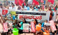 Members of SUCI (Socialist Unity Centre of India) protesting with empty pots against State Congress government and demanding to drinking water, in Bengaluru on Wednesday 13th March 2024