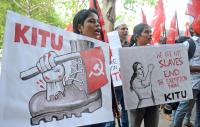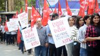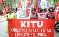 Members of Karnataka State IT ITES employees union protest demanding government to end the exemption given for the IT ITES sector from industrial employment at Karmika Bhavan, in Bengaluru on Saturday 16th March 2024