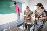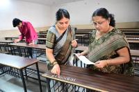 College teachers and staff writing roll number on the desks ahead of CET Exams at Sheshadripuram college, in Bengaluru on Wednesday 17th April 2024