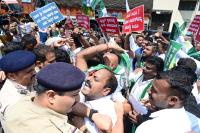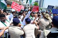 Police personnel detained JD(S) workers and leaders during their protest against State Congress government and DCM DK Shivakumar, in Bengaluru on Tuesday 7th May 2024