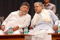 Chief Minister of Karnataka Siddaramaiah with DCM DK Shivakumar offering floral tribute to Former PM Jawaharlal Nehru portrait on his death anniversary at Bharat Jodo Bhavan, in Bengaluru on Monday 27th May 2024