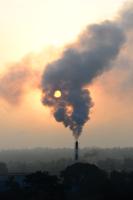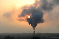 Black smoke rises out of the factory chimney in backdrop of the Sunrise, in Bengaluru on Thursday 30th May 2024
