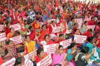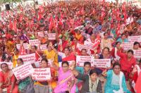 Members of Anganwadi employees Association with CITU protest and demand to increase Remuneration for Anganwadi teachers and other various issue at Freedom Park, in Bengaluru on Thursday 20th June 2024